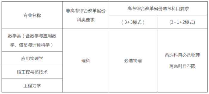 我校強基計劃的招生專業、非高考綜合改革省份科類要求及高考綜合改革省份的選考科目要求見下表。